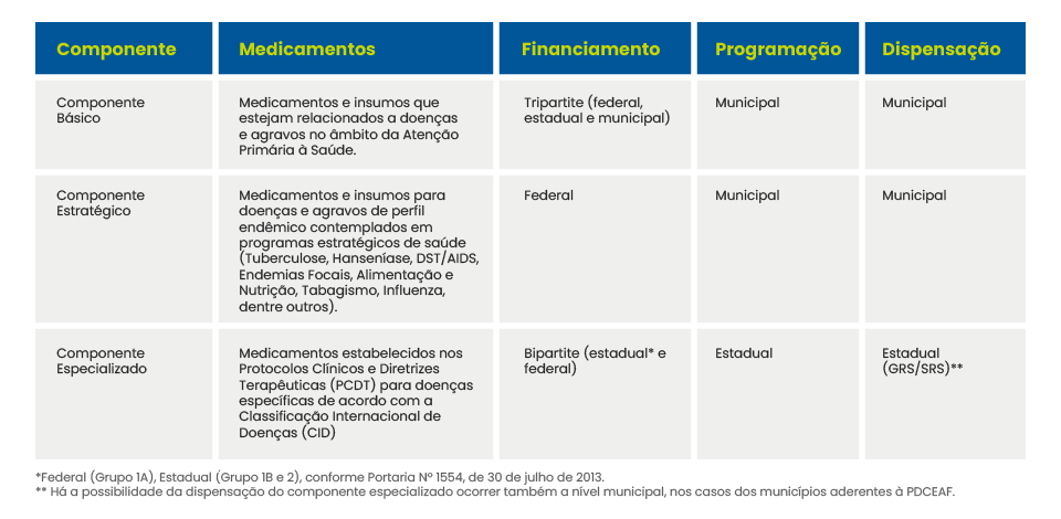 É de competência das três instâncias gestoras do SUS (União, Estados, Distrito Federal e Municípios) promover a estruturação da Assistência Farmacêutica e garantir o acesso da população aos medicamentos e o seu uso racional. A Relação Nacional de Medicamentos Essenciais (RENAME) é o instrumento promotor do uso racional e lista orientadora do financiamento de medicamentos na Assistência Farmacêutica, sendo os três componentes principais: o Componente Básico da Assistência Farmacêutica (CBAF), o Componente Estratégico da Assistência Farmacêutica (CESAF) e o Componente Especializado da Assistência Farmacêutica (CEAF), organizados conforme Tabela 01, abordado abaixo: