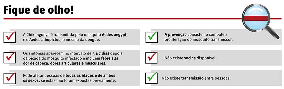 Febre acima de 39 graus, de início repentino, e dores intensas nas articulações de pés e mãos – dedos, tornozelos e pulsos. Pode ocorrer, também, dor de cabeça, dores nos músculos e manchas vermelhas na pele. Cerca de 30% dos casos não chegam a desenvolver sintomas.