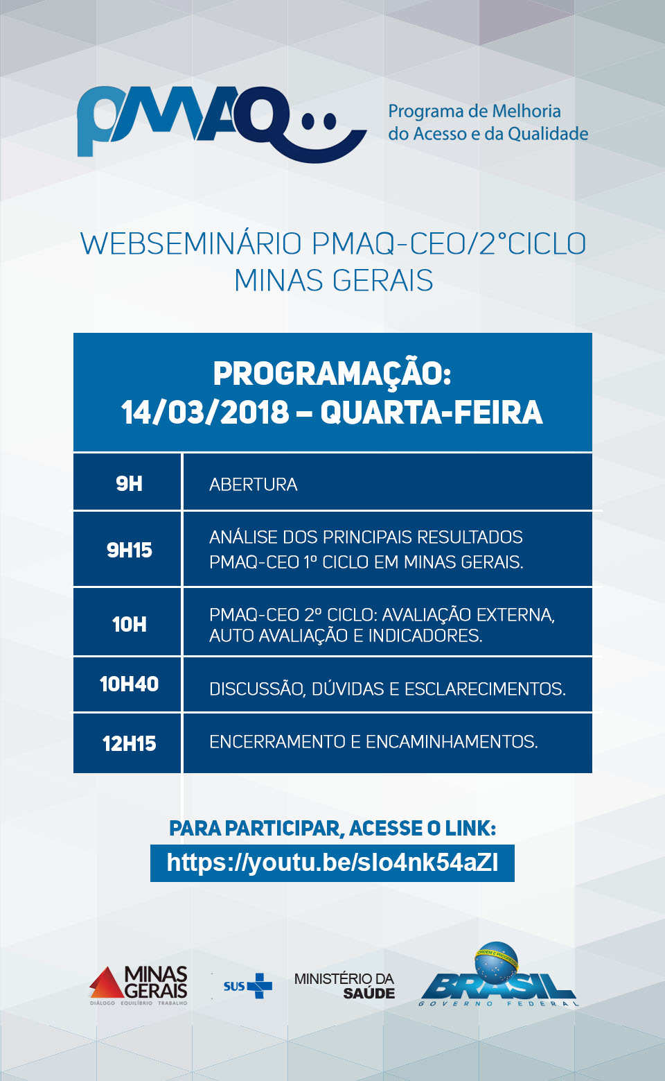 Na próxima quarta-feira (14/03), de 09h às 12h30, a Secretaria de Estado de Saúde de Minas Gerais (SES-MG), em parceria com o Núcleo de Telessaúde da Faculdade de Medicina da UFMG, promove o 2º ciclo do webseminário do Programa Nacional de Melhoria do Acesso e da Qualidade dos Centros de Especialidades Odontológicas (PMAQ-CEO) do Sistema Único de Saúde (SUS).