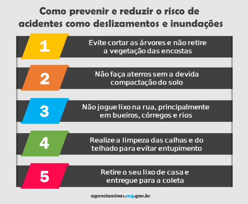 Segundo dados do Sistema de Meteorologia e Recursos Hídricos de Minas Gerais (Simge), a tendência climática para o mês de dezembro na maior parte do estado é de chuva dentro da média esperada e, nas regiões do Triângulo, Oeste e Zona da Mata, de chuvas acima da faixa normal climatológica. Assim, a Coordenadoria Estadual da Defesa Civil (Cedec) orienta a população a adotar ações preventivas durante o período chuvoso e a evitar situações de risco.