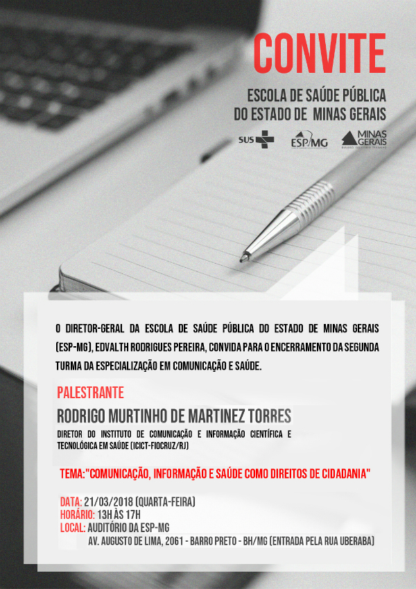 No dia 21 de março (quarta-feira), a partir de 13h, a Escola de Saúde Pública do Estado de Minas Gerais (ESP-MG), irá realizar as atividades de encerramento da 2ª turma do curso de especialização (pós-graduação) em Comunicação e Saúde, no auditório da Unidade Sede, em Belo Horizonte (MG).