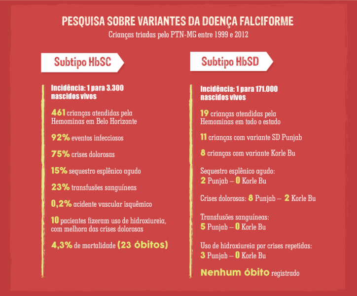 O estudo foi feito com crianças diagnosticadas pelo Programa de Triagem Neonatal de Minas Gerais (PTN-MG) entre 1999 e 2012 e encaminhadas para tratamento no ambulatório de Belo Horizonte da Hemominas. No total, foram avaliadas 480 crianças: 461 com o subtipo HbSC, considerada a segunda variante mais comum da doença falciforme e prevalência de um caso a cada 3,3 mil nascidos vivos; e 19 com HbSD, variante mais rara e que atinge um a cada 171 mil nascidos vivos. O projeto Estudo das manifestações clínicas e hematológicas da doença falciforme subtipos SC e SD em coorte de crianças do Programa de Triagem Neonatal de Minas Gerais é coordenado pelo professor Marcos Borato Viana e conta com apoio da Fundação de Amparo à Pesquisa do Estado de Minas Gerais (FAPEMIG).