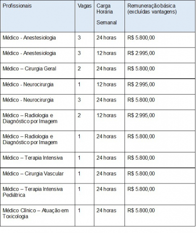 A Fundação Hospitalar do Estado de Minas Gerais (Fhemig) abre, no dia 12/7, inscrições para processo seletivo simplificado para o preenchimento de 19 vagas de médicos, em diversas especialidades, com vencimentos básicos que variam entre R$ 2.995 e R$ 5.800.