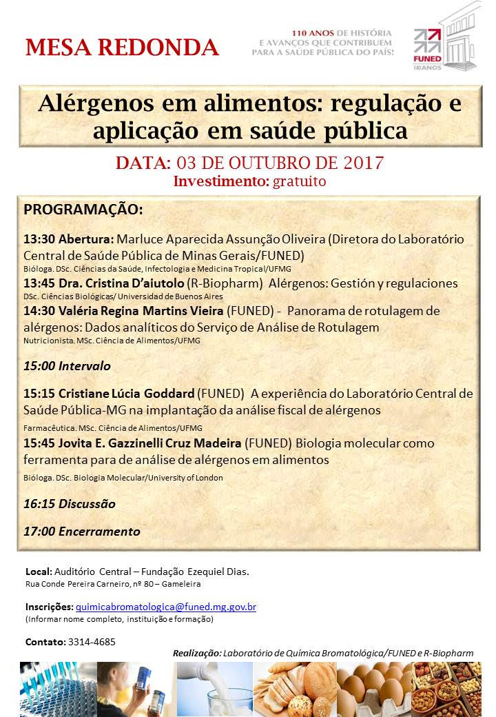 No dia 03 de outubro, o Laboratório de Química Bromatológica da Fundação Ezequiel Dias (Funed) e a R-Biopharm realizarão a mesa redonda “Alérgenos em alimentos: regulação e aplicação em saúde pública”. O evento é voltado a profissionais e estudantes da de ciências da saúde e outros que trabalhem na área regulatória, como farmacêuticos, nutricionistas, engenheiros de alimentos, biomédicos, químicos, áreas afins e outras áreas ligadas a assuntos regulatórios.