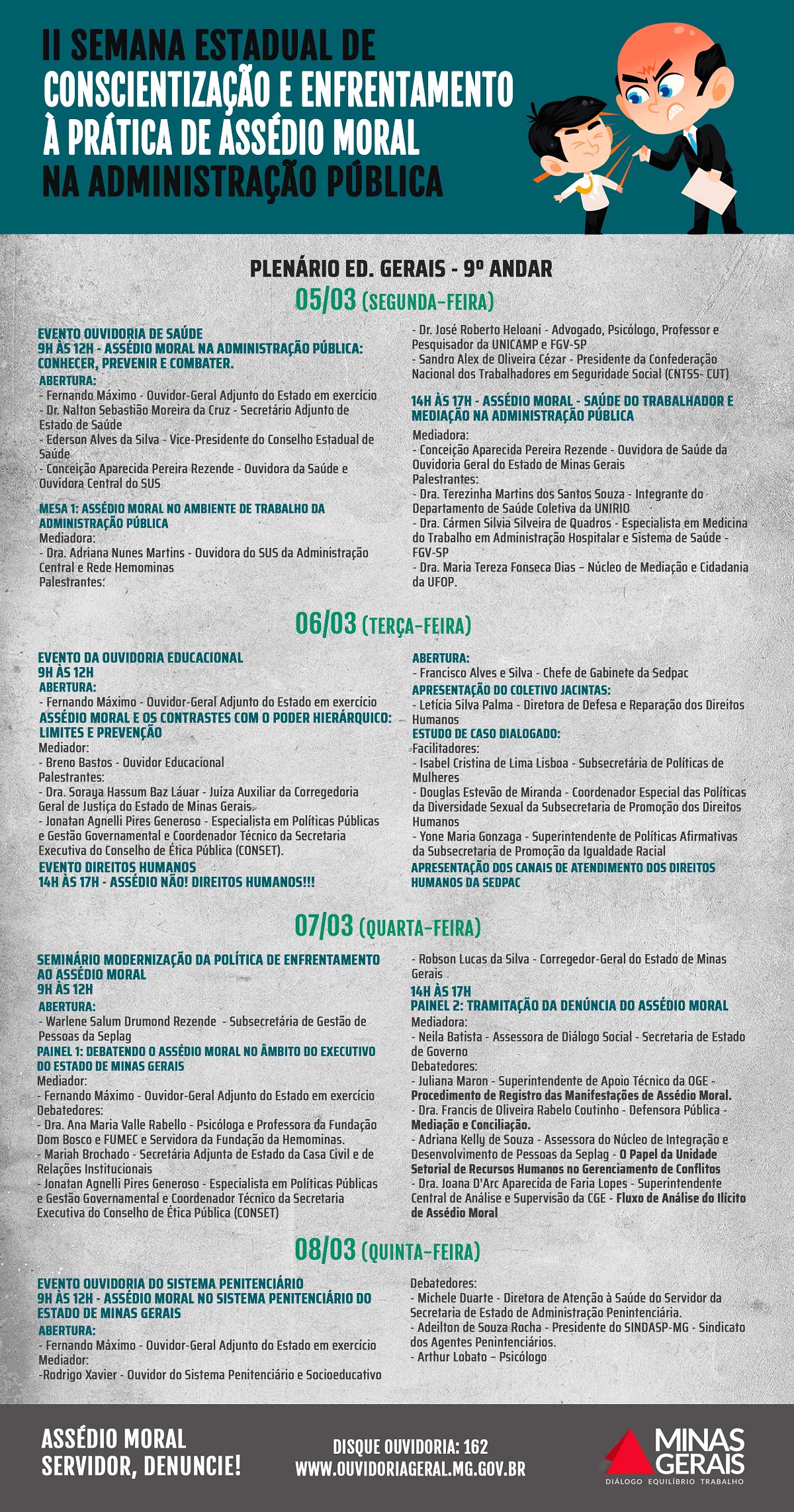 A programação integra a ações da 2ª Semana Estadual de Conscientização e Enfrentamento à Prática de Assédio Moral – em consonância com a Lei Estadual nº 22.404, promulgada pelo governador Fernando Pimentel, em dezembro 2016.