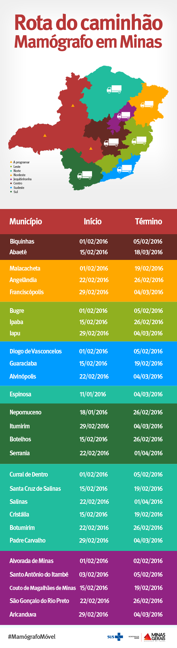 Além dos 10 caminhões equipados com mamógrafos, em Minas gerais, existem aproximadamente 196 prestadores de serviço de mamografia que atendem pelo SUS. Clique aqui e confira a relação dos prestadores que realizam a mamografia em Minas Gerais. Para outras informações sobre o câncer de mama, acesse o site: www.saude.mg.gov.br/