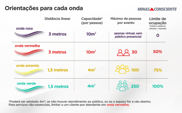 Do ponto de vista das microrregiões, nove das 89 continuam na onda roxa. Além das quatro micro que compõem a região Nordeste, metade da região Centro segue com medidas mais rígidas. São elas: Guanhães, Itabira, João Monlevade, Ouro Preto e Sete Lagoas. Outras micro poderão avançar para a faixa amarela. São elas: Manga/Januária, Araçuaí, Diamantina, Serro, Patrocínio/Monte Carmelo, São Sebastião do Paraíso.
