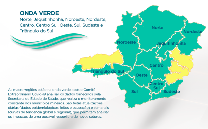 Dez das 14 macrorregiões de Saúde mineiras estão na onda verde do Minas Consciente, plano elaborado pelo Governo de Minas para garantir a retomada segura e gradual da economia nos municípios.