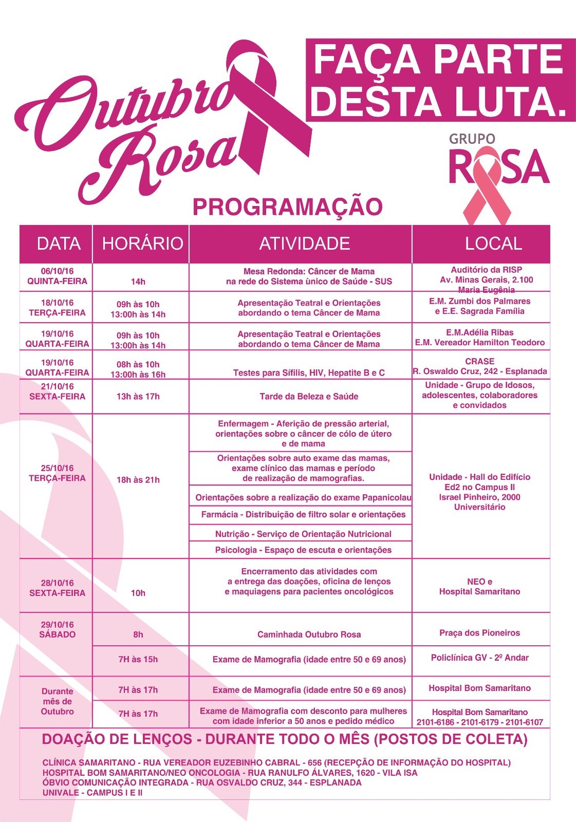 A campanha se encerra dia 29 de outubro, com concentração na praça principal onde serão oferecidos diversos serviços a população e realizada caminhada pelo centro do município. Segue a programação de atividades que serão desenvolvidas pela  campanha durante todo  o mês de outubro em  Valadares: