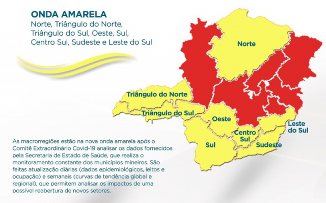 As macrorregiões de Saúde Norte, Triângulo do Norte, Triângulo do Sul, Oeste, Sul, Centro-Sul, Sudeste e Leste do Sul apresentaram índices favoráveis para a abertura de serviços não essenciais, contemplados pela onda amarela. Nesta fase, são permitidos: