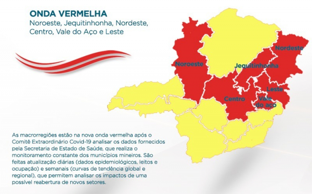 As macrorregiões de Saúde Centro, Noroeste, Jequitinhonha, Nordeste, Leste e Vale do Aço estão na onda vermelha do novo plano. Nesses locais, está autorizada a abertura dos seguintes serviços: