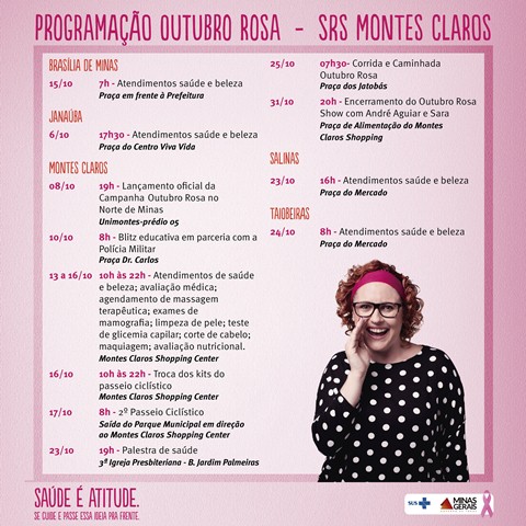 A campanha Outubro Rosa tem realização da Secretaria de Estado de Saúde de Minas Gerais (SES-MG) e da Superintendência Regional de Saúde de Montes Claros (SRS) e apoio da Associação de Indústria e Comércio de Montes Claros (ACI), Associação Presente de Apoio ao Paciente com Câncer Padre Joãozinho, Avon Cosméticos, Canal 20, Faculdades Integradas Pitágoras (FIPMoc), Hospital Dilson de Quadros Godinho, Hospital Aroldo Tourinho (HAT), Hospital Universitário Clemente de Faria (HUCF), Inter TV Grande Minas(Globo), Jornal de Notícias, Jornal Gazeta Nortemineira, Blog Let´s Go, Mary Key Cosméticos, Santa Casa de Montes Claros, Programa Revista Geraes, Programa Ronda Geraes, Programa Municipal de Saúde da Mulher e Universidade Estadual de Montes Claros – Unimontes.