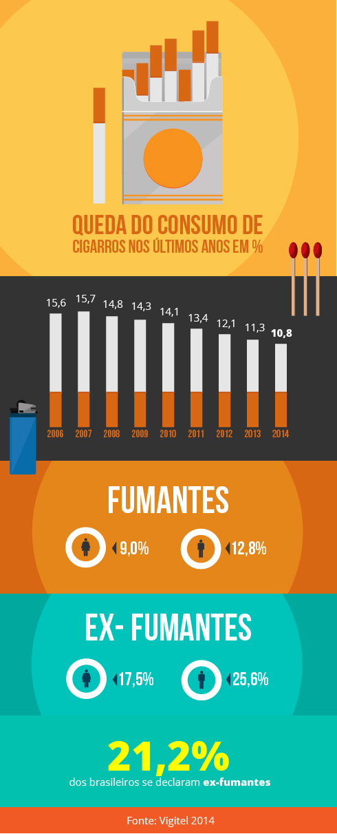 O ato de fumar está cada vez menos popular no Brasil. Segundo dados do Vigitel 2014, atualmente, 10,8% dos brasileiros ainda mantém o hábito de fumar – o índice é maior entre os homens (12,8%) do que entre as mulheres (9%). Os números representam uma queda de 30,7% no percentual de fumantes nos últimos nove anos. Em 2006, 15,6% dos brasileiros declaravam consumir o produto. A redução no consumo é resultado de uma série de ações desenvolvidas pelo governo federal para combater o uso do tabaco.