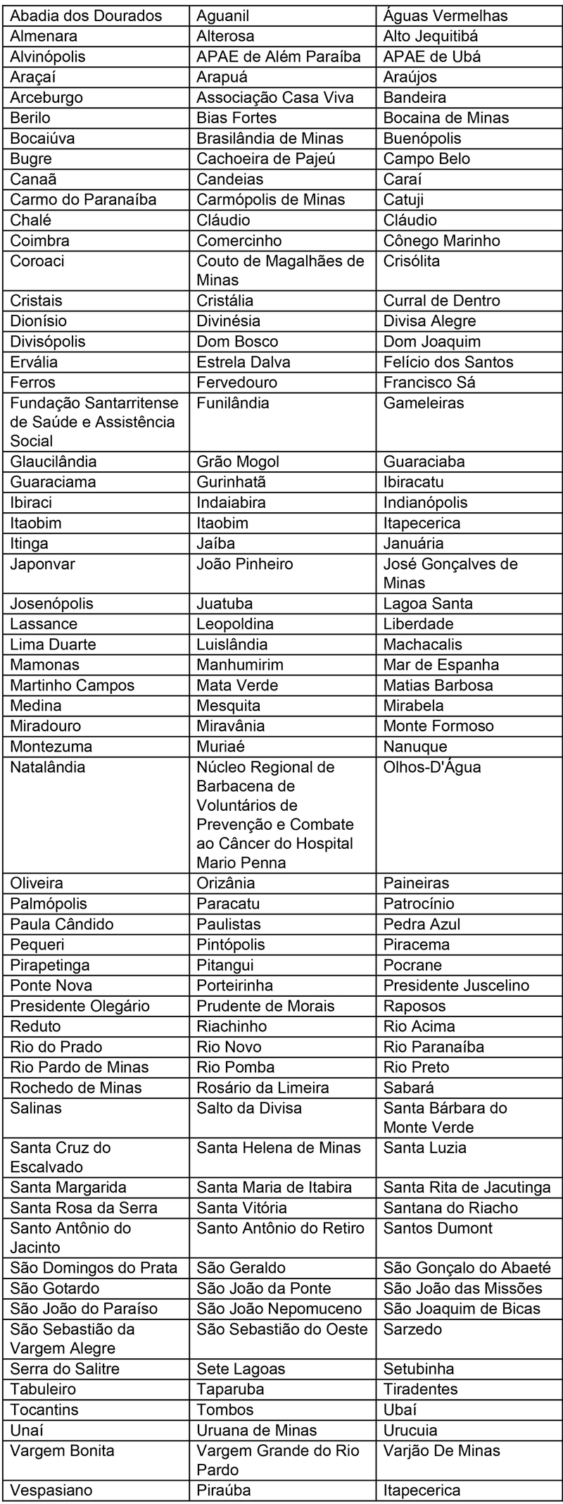 – SAMU: Itaúna (Consórcio CISURG), Divinópolis (Consórcio CISURG), Barbacena (Consórcio CISURG), Ipatinga, Itabira, Mariana, Patos de Minas, Sete Lagoas, Governador Valadares e Uberaba.