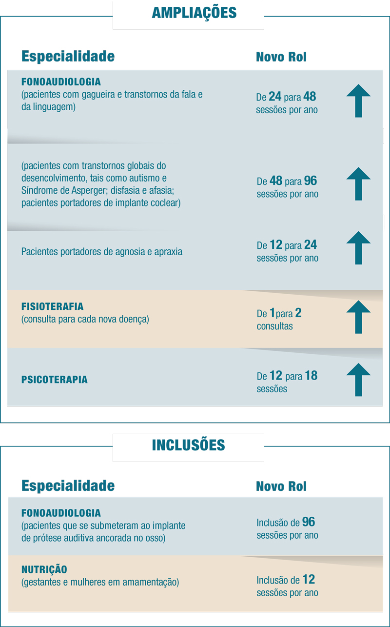 Os usuários vão ter direito a número maior de sessões com fonoaudiólogos. Elas passam de 24 para 48 ao ano para pacientes com gagueira e idade superior a 7 anos e transtornos da fala e da linguagem, de 48 para 96 para quadros de transtornos globais do desenvolvimento e autismo e 96 sessões, para pacientes que têm implante de prótese auditiva ancorada no osso.