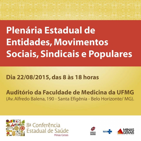 Acontece no próximo sábado, 22/08, a Plenária Estadual de Entidades, Movimentos Sociais, Sindicais e Populares de Minas Gerais, etapa da 8ª Conferência Estadual de Saúde (CESMG). A plenária acontece das 8 às 18 horas, no auditório da Faculdade de Medicina da UFMG (Av. Alfredo Balena, 190 – Santa Efigênia, Belo Horizonte).