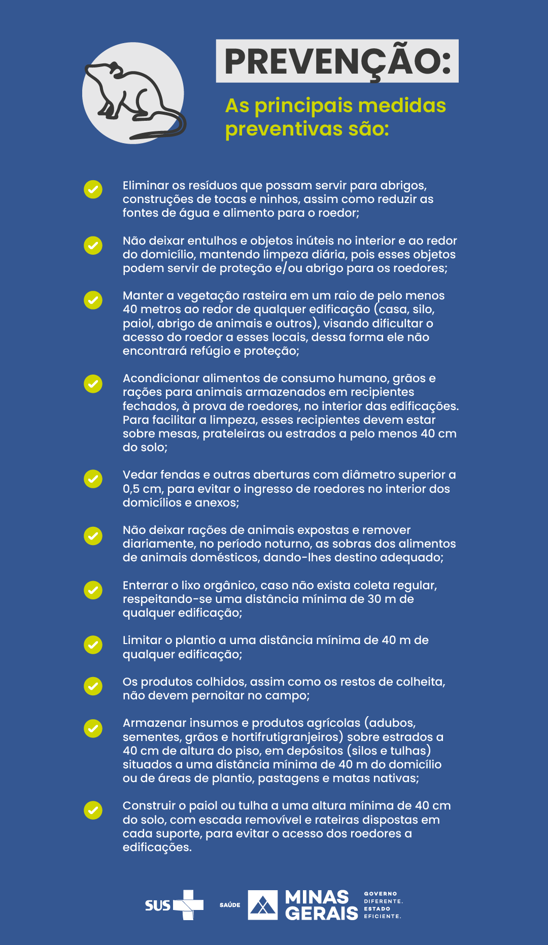 A referência técnica da Vigilância das Hantaviroses da Secretaria de Estado de Saúde de Minas Gerais (SES-MG), Andréia Roberto Santos, explica que o combate à doença exige medidas preventivas de higiene, principalmente, nas áreas rurais. Segundo a técnica, os roedores costumam procurar por alimento e abrigo em locais utilizados para armazenamento de grãos. “Não existe vacina contra a hantavirose. Até o momento, a prevenção baseia-se em medidas que impedem a interação entre o homem e roedores silvestres, nos locais onde é conhecida a presença desses animais”, disse