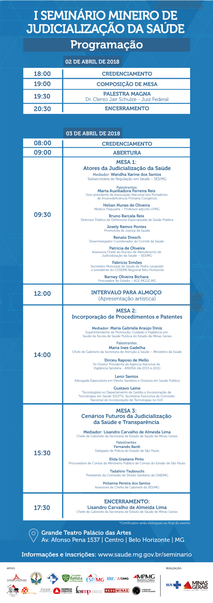 Programação do I Seminário Mineiro de Judicialização da Saúde 28 de março de 2018 Ver documento – Tamanho: 1.07 MB Compartilhe via: