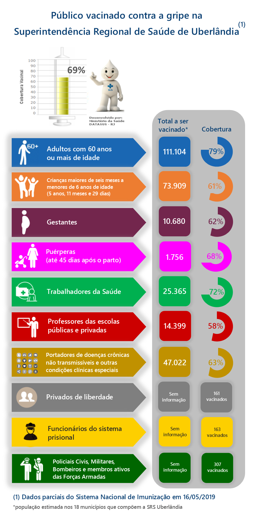 A campanha de vacinação segue até o dia 31 de maio. Os grupos prioritários para a Campanha Nacional de Vacinação contra a Influenza 2019 são: crianças na faixa etária de seis meses a menores de seis anos de idade (cinco anos, 11 meses e 29 dias), as gestantes, as puérperas (até 45 dias após o parto), trabalhadores de saúde, professores de escolas públicas e privadas, indígenas, indivíduos com 60 anos ou mais de idade, adolescentes e jovens de 12 a 21 anos de idade sob medidas socioeducativas, população privada de liberdade, funcionários do sistema prisional, pessoas portadores de doenças crônicas não transmissíveis e outras condições clínicas especiais e forças de segurança e salvamento. A meta é vacinar, pelo menos, 90% de cada grupo. Até o momento, a cobertura da região de Uberlândia está em 69%, e os grupos que mais preocupam são as crianças e gestantes por conta da baixa cobertura e por serem os públicos mais vulneráveis à influenza. Clique e veja a cobertura da SRS Uberlândia detalhada.