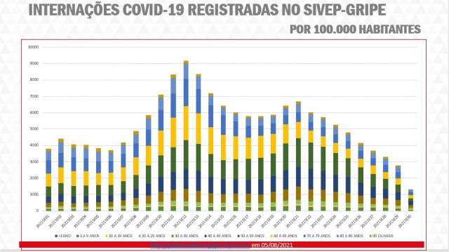 Ao longo da coletiva, Fábio Baccheretti apresentou o gráfico das internações por covid-19 em Minas, com as proporções para faixas etárias, de 03/01/2021 a 31/07/02021.