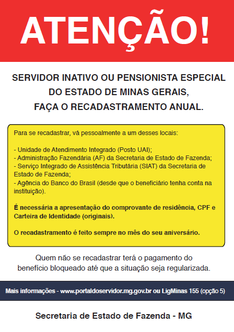 O recadastramento anual dos servidores inativos e pensionistas especiais do Estado de Minas Gerais é obrigatório e deve ser feito sempre no mês de aniversário. Porém, apesar dos alertas publicados nos canais de contato oficiais do Governo Estadual junto a esse público, muitos deixam de cumprir a exigência e, por isso, têm o seu vencimento suspenso ou bloqueado até a regularização.