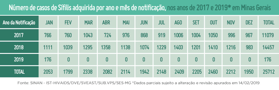 A sífilis adquirida traz sérias complicações para a saúde humana. É caracterizada por feridas nos órgãos genitais, erupções pelo corpo e nas mucosas, danos no cérebro, medula espinhal e vasos sanguíneos. “Nessa modalidade da doença, 95% dos casos são devido ao contato com as lesões nos órgãos genitais”, explica Mayara. Em 2018, Minas Gerais registrou 14.457 casos de sífilis adquirida. Em 2019, até o dia 14 de fevereiro, 176 casos da doença foram notificados.