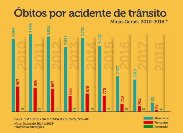 Em Minas Gerais, de acordo com os dados do Boletim de Vigilância de Doenças e Agravos Não Transmissíveis, no período de 2010 a fevereiro de 2018, os homens apresentaram maior percentual de óbitos por acidentes, com 81% e as mulheres com 19%. Em números absolutos, em 2010 houve registro de 3.684 óbitos masculinos e 907 femininos por ocorrência de acidente de trânsito; em 2011 o número de ocorrência masculina subiu para 3.953 e o de mulheres caiu para 896; em 2012 o índice óbitos por acidentes de trânsito envolvendo homens caiu para 3.832 e o de mulheres 867; em 2013 os óbitos masculinos ficaram em 3.651 e o de mulheres 823. Já em 2018, foram registrados, até fevereiro, 95 ocorrências de óbitos masculinos e 31 femininos.