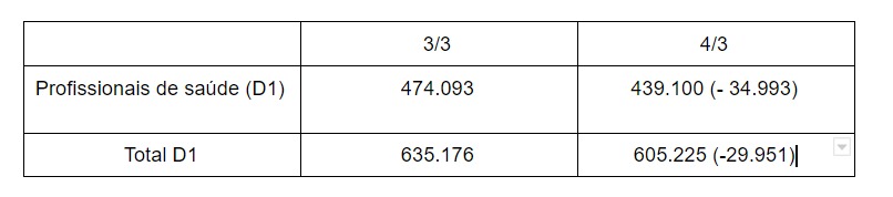Com a revisão de informações duplicadas e a mudança da metodologia, no Vacinômetro de hoje (4/3), o número de doses aplicadas (D1) em profissionais de saúde e o total de doses aplicadas (D1), bem como as suas coberturas vacinais, tiveram uma redução, conforme segue:
