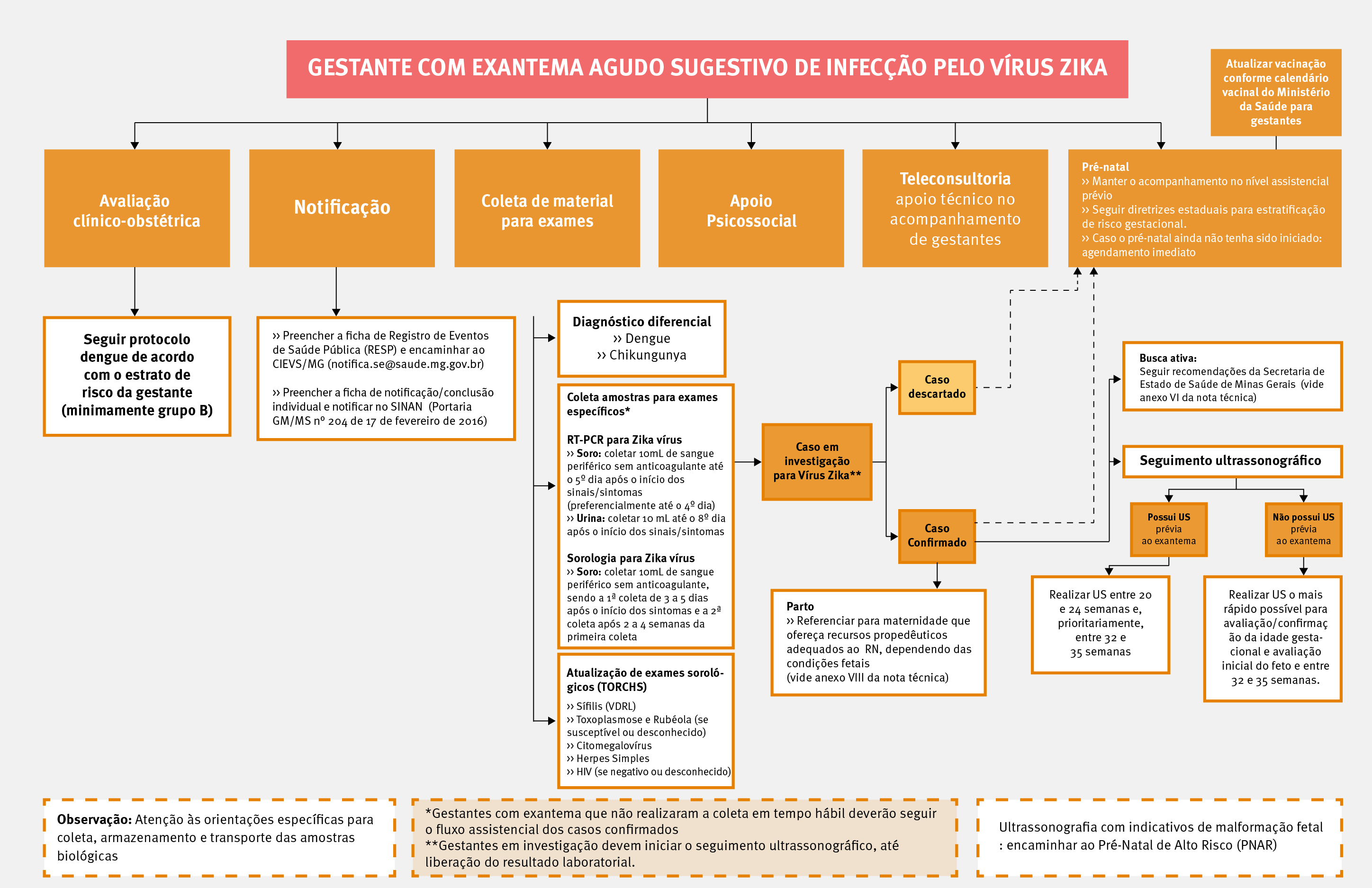 Desde o final do ano passado, quando o Ministério da Saúde estabeleceu uma possível relação entre o aumento de casos de microcefalia no Nordeste do país com a infecção pelo Zika Vírus, o alerta para as grávidas também cresceu. Sabendo da importância de um acompanhamento mais próximo das gestantes que apresentam sinais da doença, a Secretaria de Estado de Saúde de Minas Gerais (SES-MG), com base nos protocolos do Ministério da Saúde e definições da Organização Mundial de Saúde, elaborou fluxogramas para o acompanhamento de seis situações clínicas distintas. O intuito é garantir o devido atendimento a esses casos, orientando a rede assistencial quanto a procedimentos necessários durante o acompanhamento das mulheres.