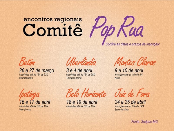 A Secretaria de Estado de Saúde de Minas Gerais (SES-MG) participou nos dias 03 e 04/04, em Uberlândia, da etapa regional do Fórum Técnico para a elaboração do Plano Estadual da Política para a População em Situação de Rua. Coordenado pela Secretaria de Estado de Direitos Humanos, Participação Social e Cidadania (Sedpac), por meio do Comitê Intersetorial de Acompanhamento e Monitoramento da Política Estadual da População em Situação de Rua, Comitê PopRua-MG, a etapa regional está sendo realizada entre os dias 26 de março e 25 de abril em Belo Horizonte, Betim, Uberlândia, Ipatinga, Montes Claros e Juiz de Fora.