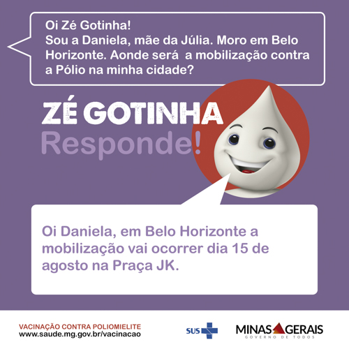 Neste sábado (15/08), a Secretaria de Estado de Saúde de Minas Gerais (SES-MG), em parceria com a Secretaria Municipal de Saúde de Belo Horizonte, promove na capital mineira, a partir das 8h, o Dia D de Vacinação contra a Poliomielite. No dia serão realizadas apresentações culturais voltadas para o público infantil, na Praça JK, região centro-sul da capital.