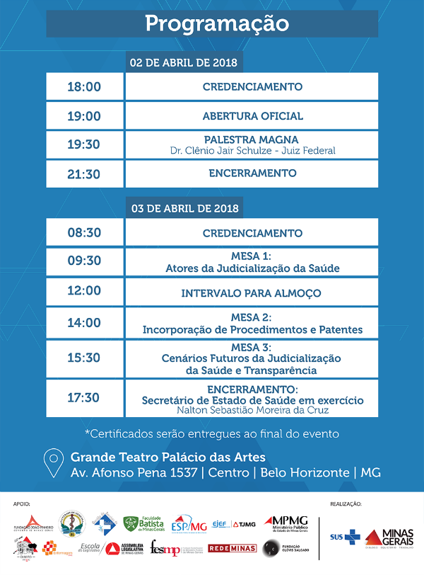 “Destacamos a importância de ampliar essa discussão com a sociedade, os diversos órgãos de controle e as variadas esferas de governo. Nesse sentido, incentivamos a ampla a participação de todos nesse primeiro encontro mineiro da judicialização da Saúde”, reforçou Wandha dos Santos. Abaixo, confira a programação: