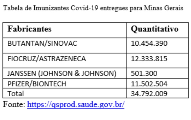 O estado recebeu, segundo o portal da Secretaria de Estado de Saúde de Minas Gerais (SES-MG), até 29 de outubro de 2021, 32.783.509 de imunizantes, mais 5% de reserva técnica e 800 mil doses interditadas pela Agência Nacional de Vigilância Sanitária (Anvisa). As doses foram distribuídas segundo tabela abaixo: