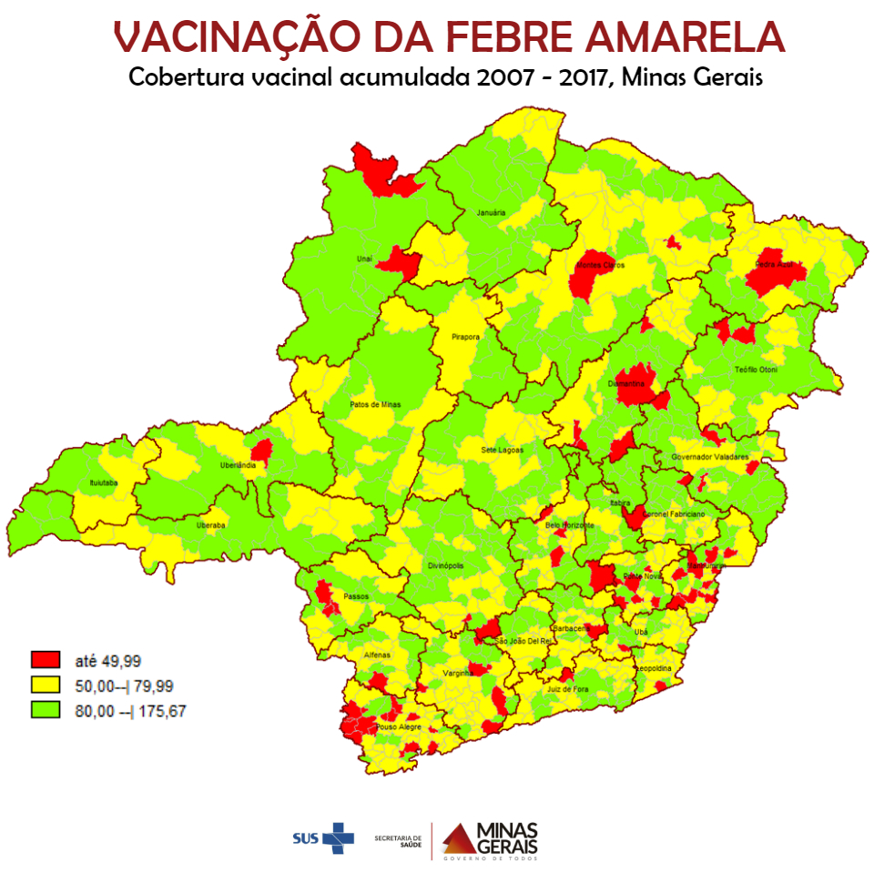 As campanhas de vacinação alcançaram resultados bastante expressivos em Minas Gerais, que apresenta atualmente a cobertura acumulada (2007 a 2017) de cerca de 80% da população imunizada contra a doença. No entanto, como a meta estipulada pelo Ministério da Saúde é que 95% da população seja vacinada, é preciso reforçar a importância da imunização. “Cerca de 4 milhões de pessoas ainda não se vacinaram e esse número traz um alerta a toda população. Sabendo que o vírus da Febre Amarela circula no estado, as pessoas não vacinadas, uma vez infectadas, podem desencadear um novo surto da doença”, ressaltou a coordenadora de Imunização da SES-MG, Eva Lídia Arcoverde Medeiros.